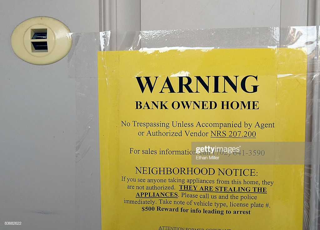 LAS VEGAS – NOVEMBER 13: A warning sign is posted on the front door of a foreclosed home November 13, 2008 in Las Vegas, Nevada. A report by RealtyTrac Inc. found that Nevada had the highest foreclosure rate in the nation for the 22nd consecutive month in October with one in every 74 homes receiving a foreclosure filing. (Photo by Ethan Miller/Getty Images)